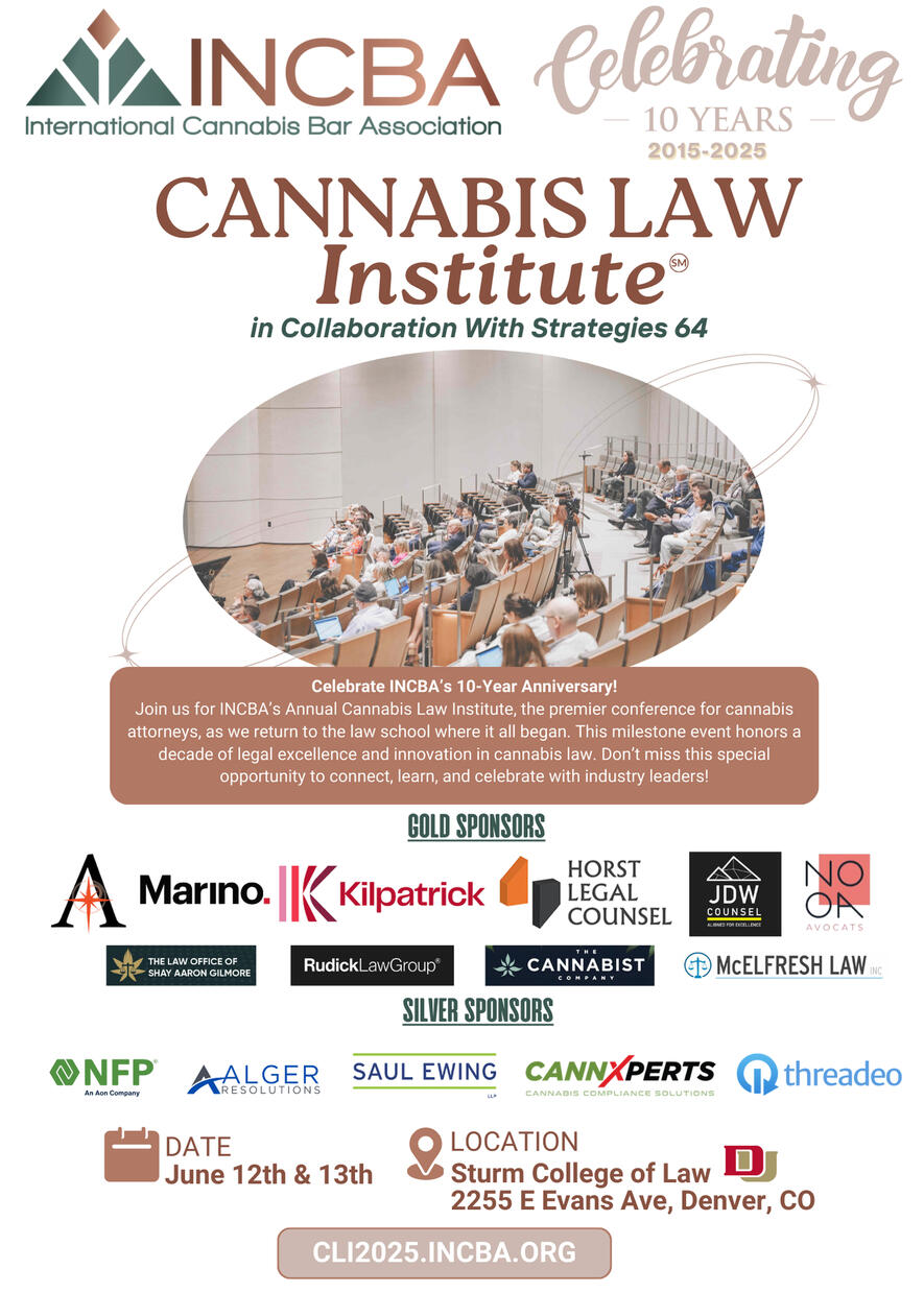 The International Cannabis Bar Association (INCBA) is thrilled to announce the Cannabis Law Institute 2025 (CLI 2025), the marquee conference dedicated to advancing legal excellence in the rapidly evolving cannabis industry. This dynamic event is widely considered to be the preeminent annual conference for cannabis law practitioners, will take place June 12th & 13th, 2025, at Sturm College of Law University of Denver in Denver, Colorado.